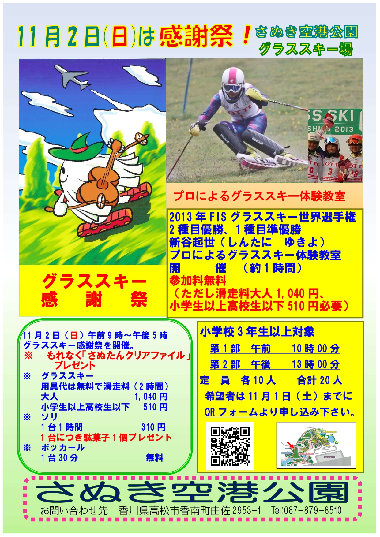 当日ご来場の皆さんに、もれなく「さぬたんクリアファイル」やお菓子をプレゼントするほか、グラススキ−の用具代が無料になります。